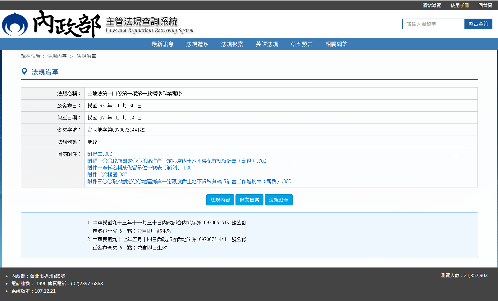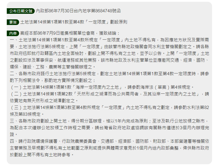 土地法第14條所規定不得私有之土地,乃係基於其或為天然富源地、重要國防、水利交通或為公共海岸需用土地,顧及公共利益,宜歸國家所有。為因應續辦公地放領查註作業,內政部前以86年7月30日台內地字第8684748號函請各直轄市、縣(市)政府迅即就行政轄區內土地全面檢討,劃設土地法第14條第1項第1款至第4款之不得私有土地,並予以公告。另為利各直轄市、縣(市)政府辦理劃設公告土地法第14條第1項第1款不得私有土地作業,內政部於93年 11月30日訂定及97年5月14日修訂「土地法第14條第1項第1款標準作業程序」及執行計畫相關範例等規定。