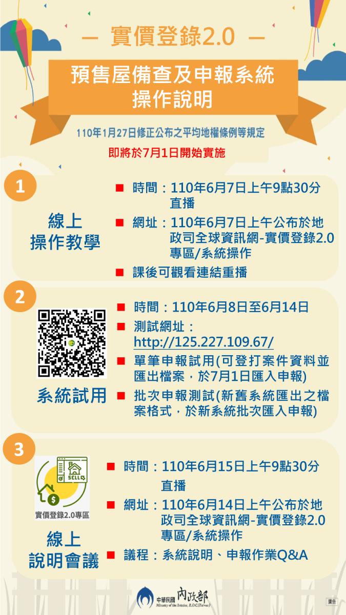 實價登錄2.0將於110/7/1上路,內政部分別訂於6/7及6/15上午9點30分辦理「預售屋備查及申報系統操作」線上操作教學及說明會議(線上直播),請不動產代銷業者及銷售預售屋者踴躍上線觀看學習,以利日後新制業務之執行。