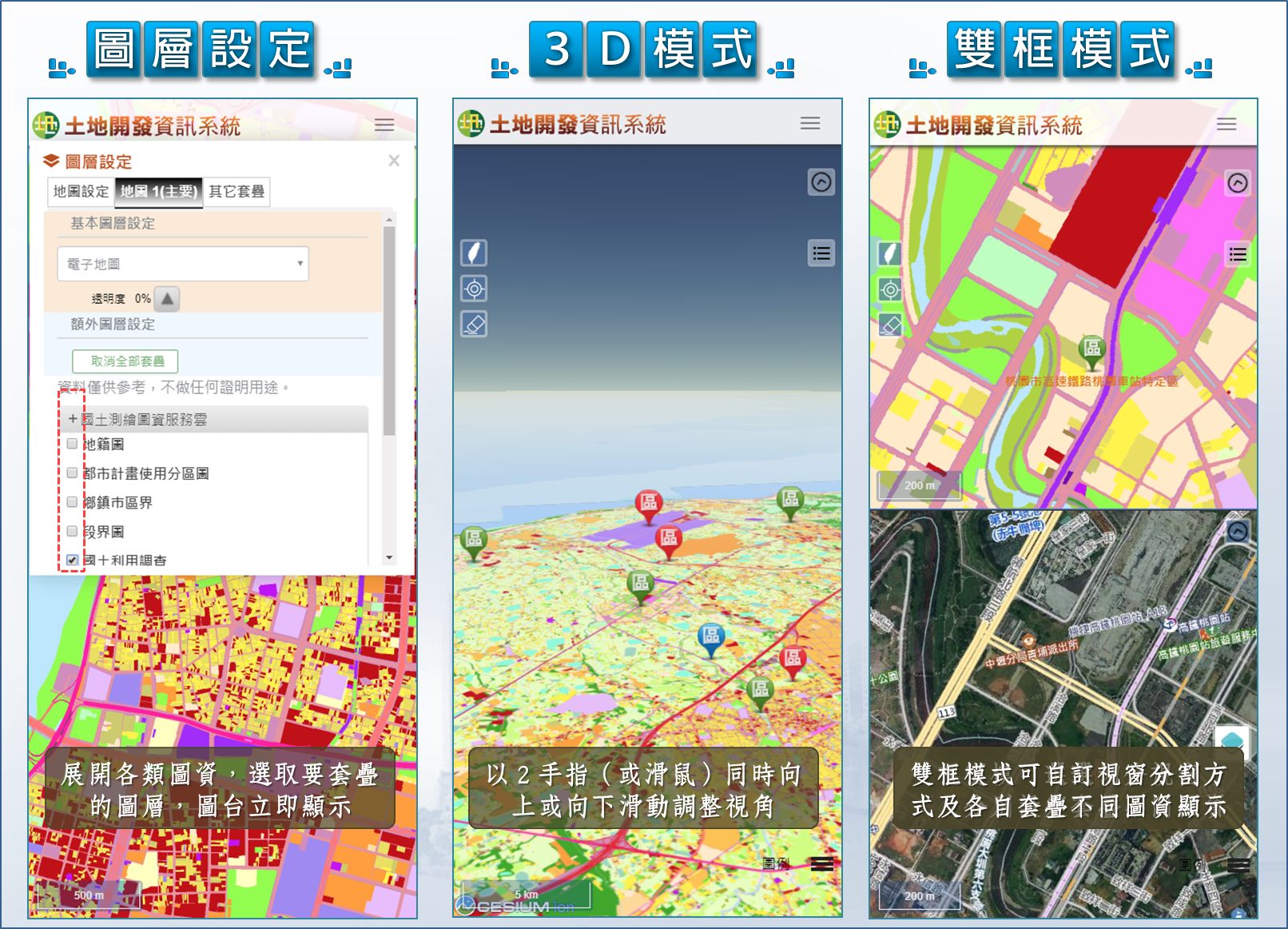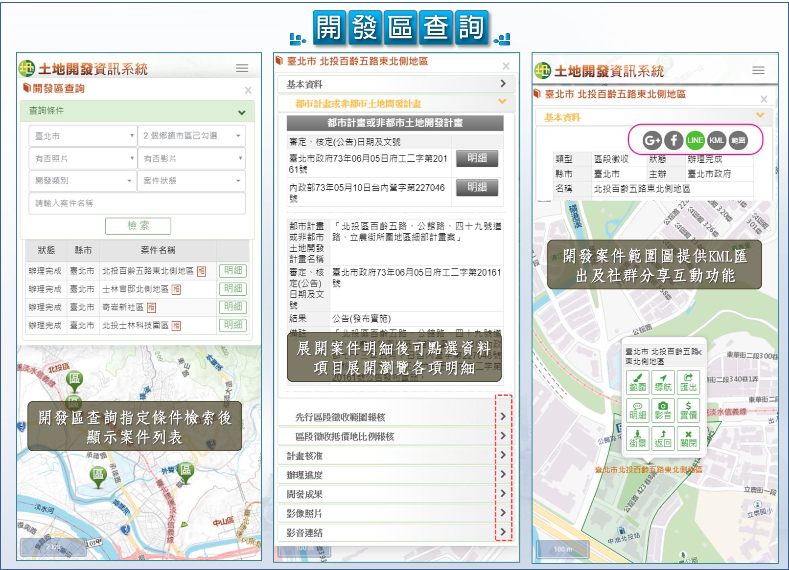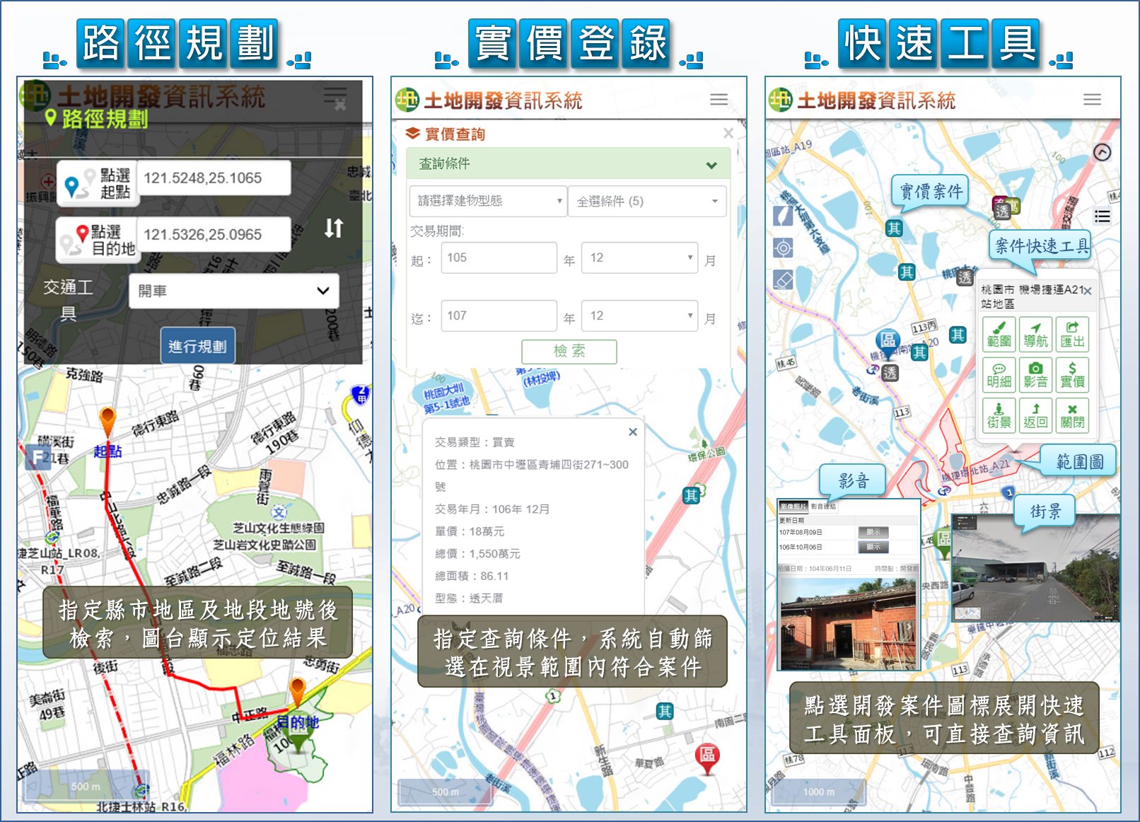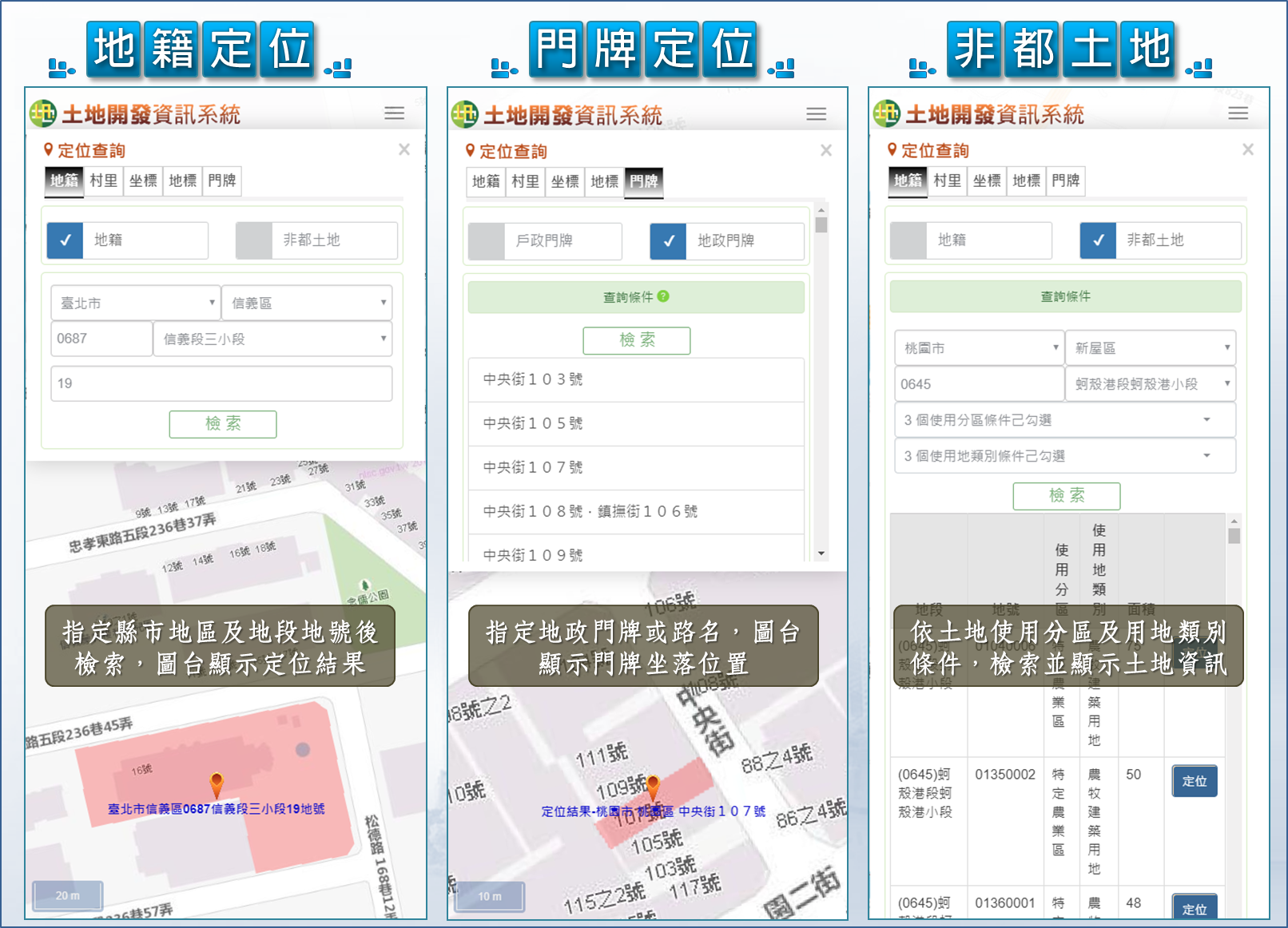 本系統提供區段徵收、市地重劃及農村社區土重劃案件開發案件資訊(重劃案件108年10月後始開放查詢);另提供非都市土地及地籍、村裡、坐標、門牌等多種定位方式查詢土地資訊,土地定位結果可再結合實價登錄案件資訊或路徑導航功能,及套疊多種土地使用圖資進行進階應用。歡迎各界多加利用。